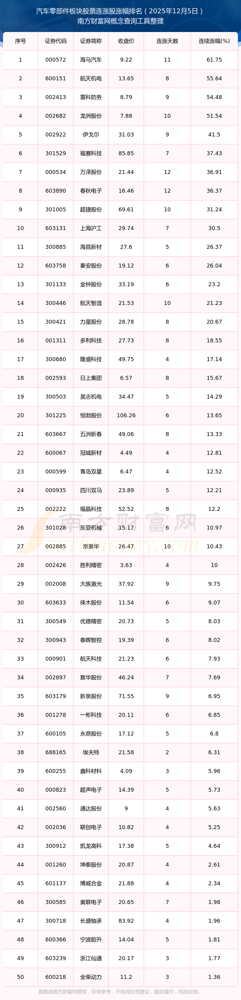 根據(jù)南方財(cái)富網(wǎng)概念查詢工具數(shù)據(jù)統(tǒng)計(jì),截止2025年12月5日收盤,汽車零部件板塊股票共有94只個(gè)股實(shí)現(xiàn)連漲。其中連續(xù)漲幅較大的個(gè)股有海馬汽車、航天機(jī)電、雷科防務(wù)等,連續(xù)漲幅分別為61.75%、55.64%、54.48%。