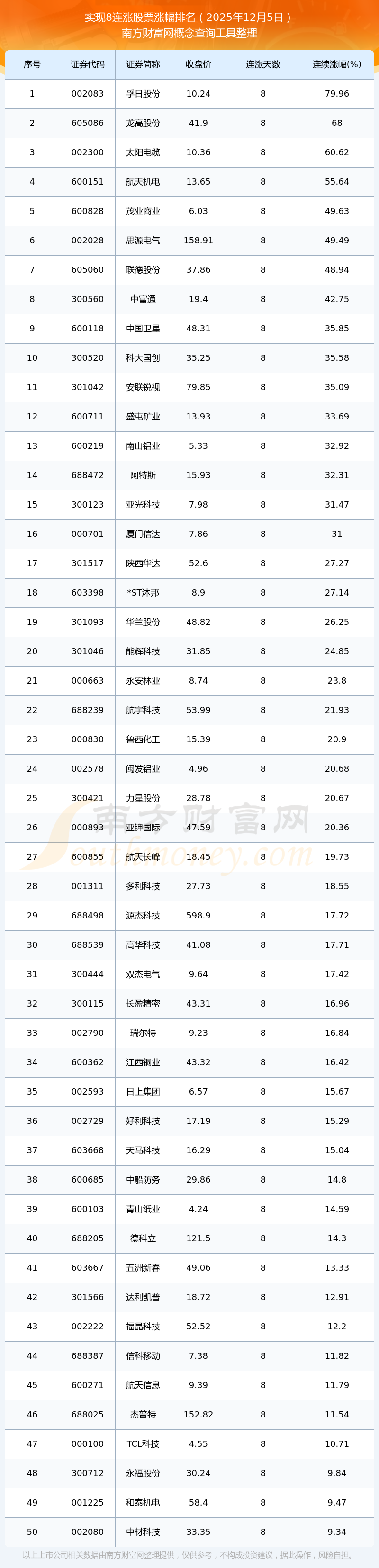 2025年12月5日實現(xiàn)8連漲股票漲幅排名