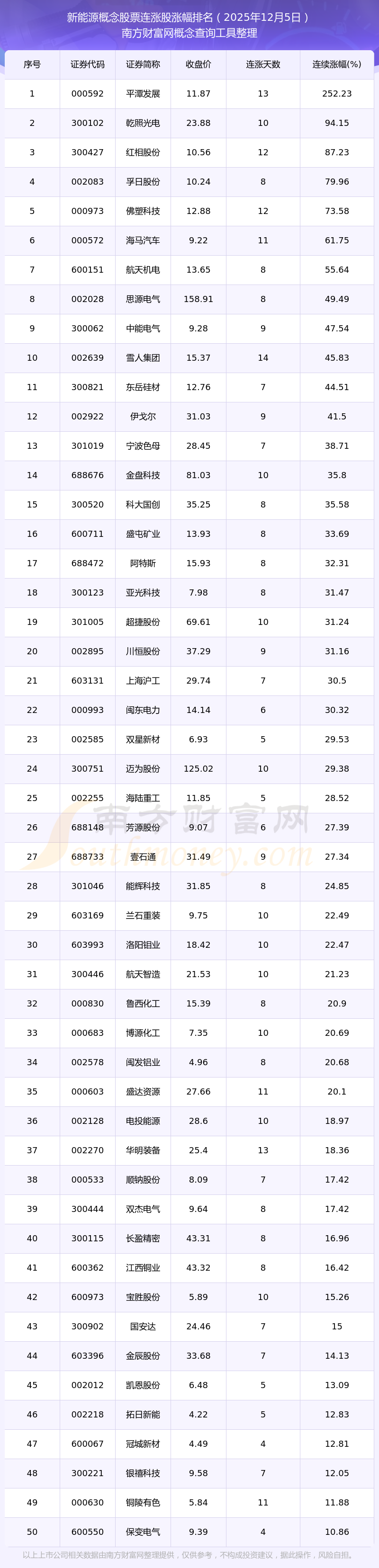 根據(jù)南方財(cái)富網(wǎng)概念查詢(xún)工具數(shù)據(jù)統(tǒng)計(jì),截止2025年12月5日收盤(pán),新能源概念股票共有155只個(gè)股實(shí)現(xiàn)連漲。其中連續(xù)漲幅較大的個(gè)股有平潭發(fā)展、乾照光電、紅相股份等,連續(xù)漲幅分別為252.23%、94.15%、87.23%。