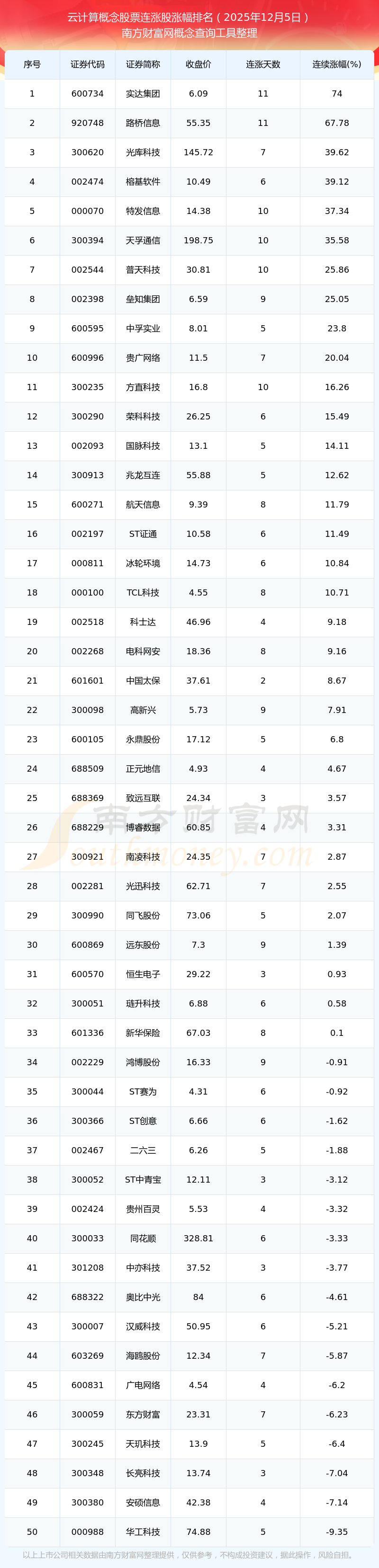 根據(jù)南方財富網(wǎng)概念查詢工具數(shù)據(jù)統(tǒng)計,截止2025年12月5日收盤,云計算概念股票共有55只個股實現(xiàn)連漲。其中連續(xù)漲幅較大的個股有實達(dá)集團、路橋信息、光庫科技等,連續(xù)漲幅分別為74.00%、67.78%、39.62%。