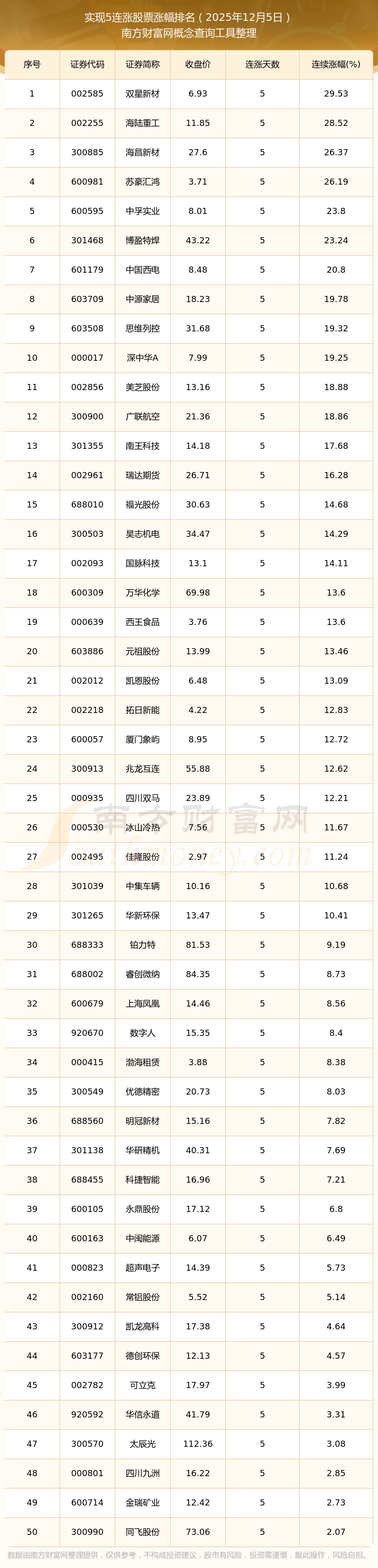 根據(jù)南方財(cái)富網(wǎng)概念查詢工具數(shù)據(jù)統(tǒng)計(jì),截止2025年12月5日收盤,共有98只個(gè)股實(shí)現(xiàn)5天連漲。其中連續(xù)漲幅較大的個(gè)股有雙星新材、海陸重工、海昌新材等,連續(xù)漲幅分別為29.53%、28.52%、26.37%。