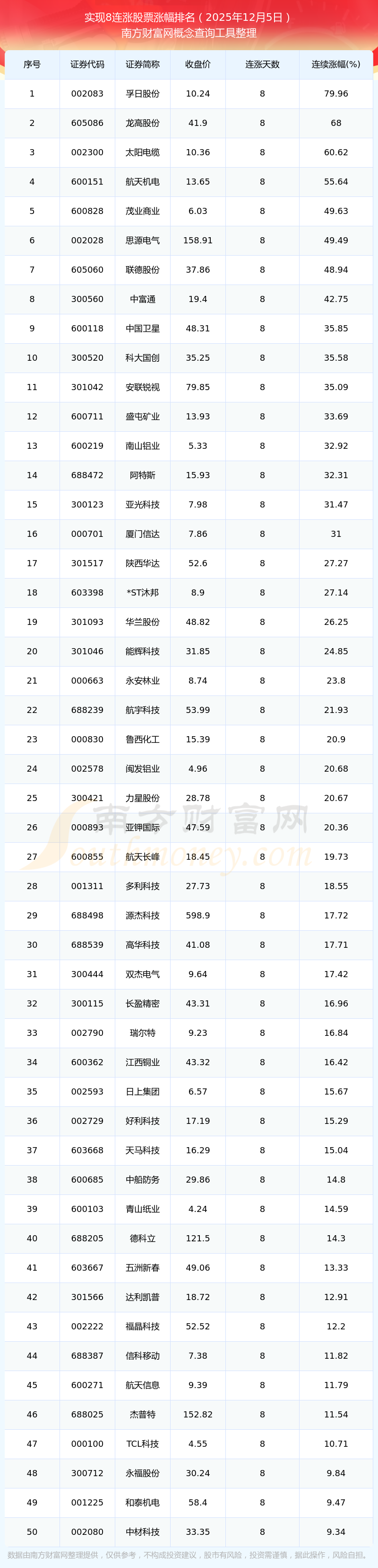 2025年12月5日實(shí)現(xiàn)8連漲股票漲幅排名