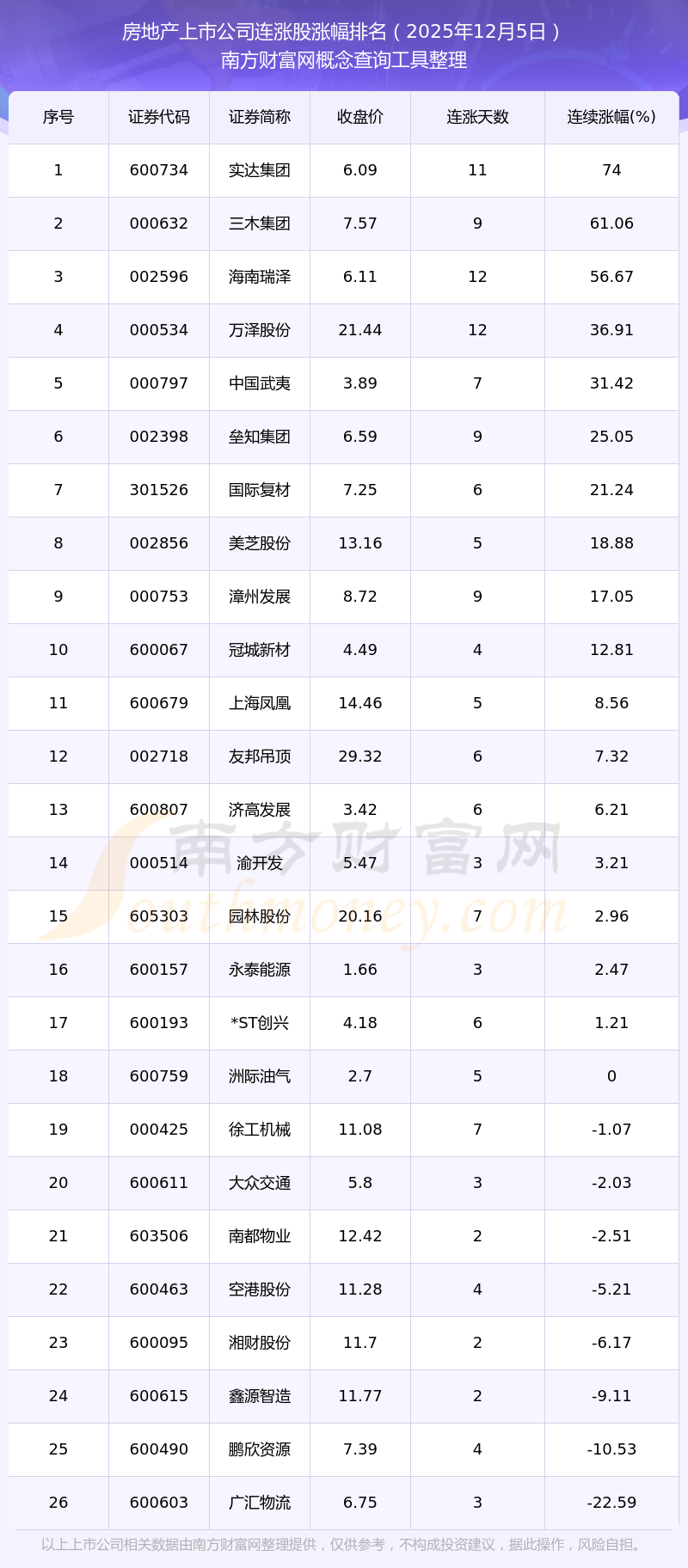 根據(jù)南方財富網(wǎng)概念查詢工具數(shù)據(jù)統(tǒng)計,截止2025年12月5日收盤,房地產(chǎn)上市公司共有26只個股實現(xiàn)連漲。其中連續(xù)漲幅較大的個股有實達(dá)集團(tuán)、三木集團(tuán)、海南瑞澤等,連續(xù)漲幅分別為74.00%、61.06%、56.67%。