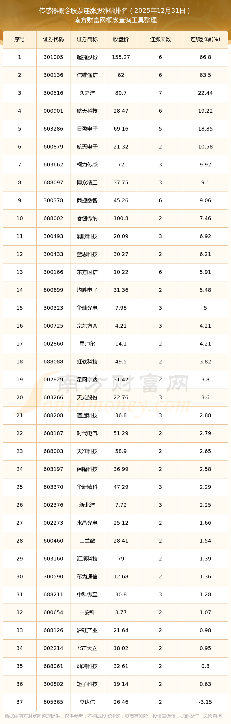 根據(jù)南方財(cái)富網(wǎng)概念查詢工具數(shù)據(jù)統(tǒng)計(jì),截止2025年12月31日收盤,傳感器概念股票共有37只個股實(shí)現(xiàn)連漲。其中連續(xù)漲幅較大的個股有超捷股份、信維通信、久之洋等,連續(xù)漲幅分別為66.80%、63.50%、22.44%。