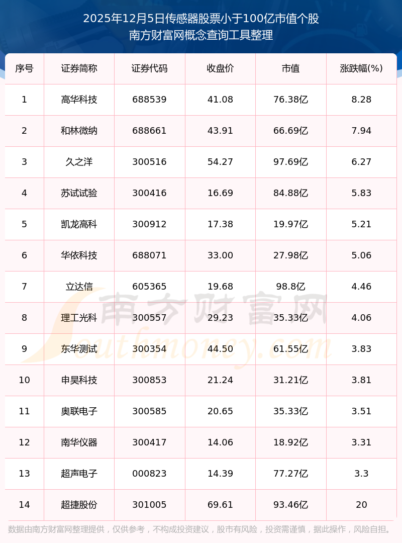 截止2025年12月5日,傳感器股票市值小于100億的個股共有14只。其中,市值較高的有立達(dá)信、久之洋、超捷股份,市值分別為98.8億元、97.69億元、93.46億元。
