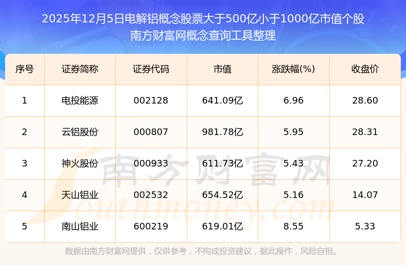 股價上看,截止2025年12月5日收盤,這些股票股價上漲的有5只,占比100%,其中,漲幅大于5%的股票有5只,漲幅較大的分別為南山鋁業(yè)、電投能源、云鋁股份,漲幅為8.55%、6.96%、5.95%。