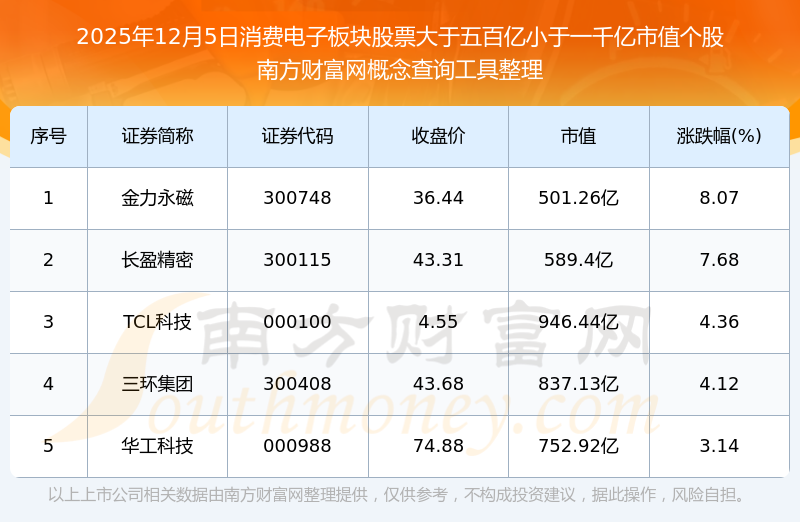截止2025年12月5日,消費電子板塊股票市值大于五百億小于一千億的個股共有5只。其中,市值較高的有TCL科技、三環(huán)集團、華工科技,市值分別為946.44億元、837.13億元、752.92億元。