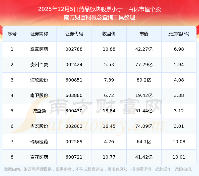 截止2025年12月5日,藥品板塊股票市值小于一百億的個股共有8只。其中,市值較高的有海欣股份、貴州百靈、吉宏股份,市值分別為89.2億元、77.29億元、74.09億元。