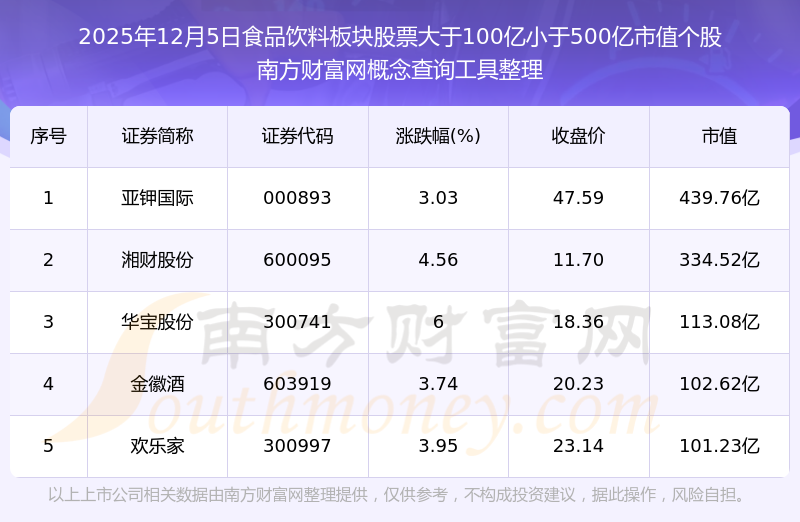 截止2025年12月5日,食品飲料板塊股票市值大于100億小于500億的個(gè)股共有5只。其中,市值較高的有亞鉀國(guó)際、湘財(cái)股份、華寶股份,市值分別為439.76億元、334.52億元、113.08億元。