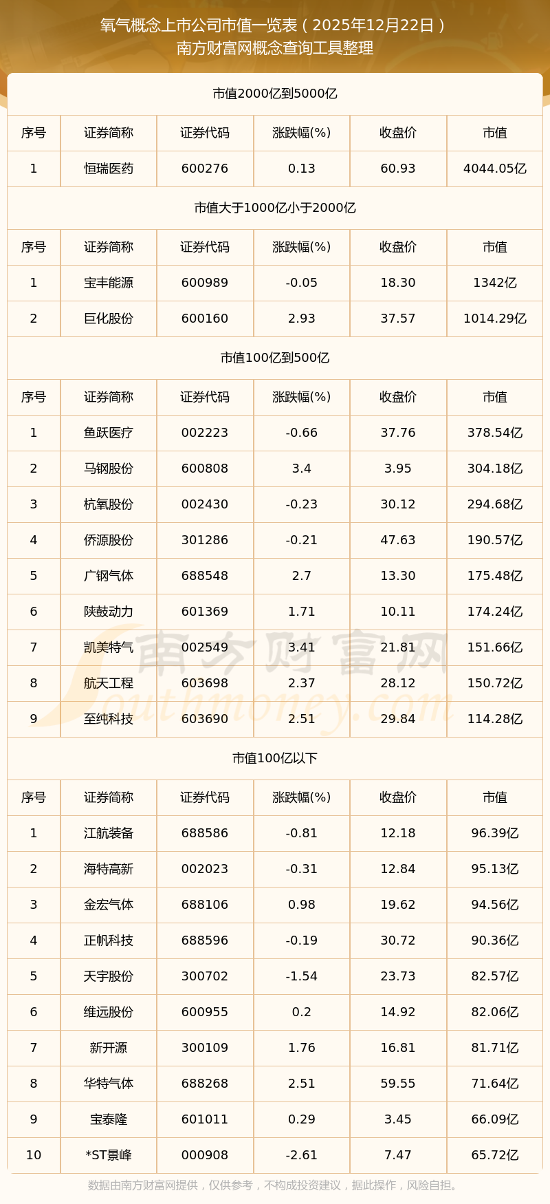 截止2025年12月22日,氧氣概念上市公司中江航裝備、海特高新、金宏氣體等18家市值位于不足100億之列;魚躍醫(yī)療、馬鋼股份、杭氧股份、僑源股份等9家市值位于100億到500億之列;寶豐能源和巨化股份市值位于1000億到2000億之列;恒瑞醫(yī)藥市值位于2000億到5000億之列。