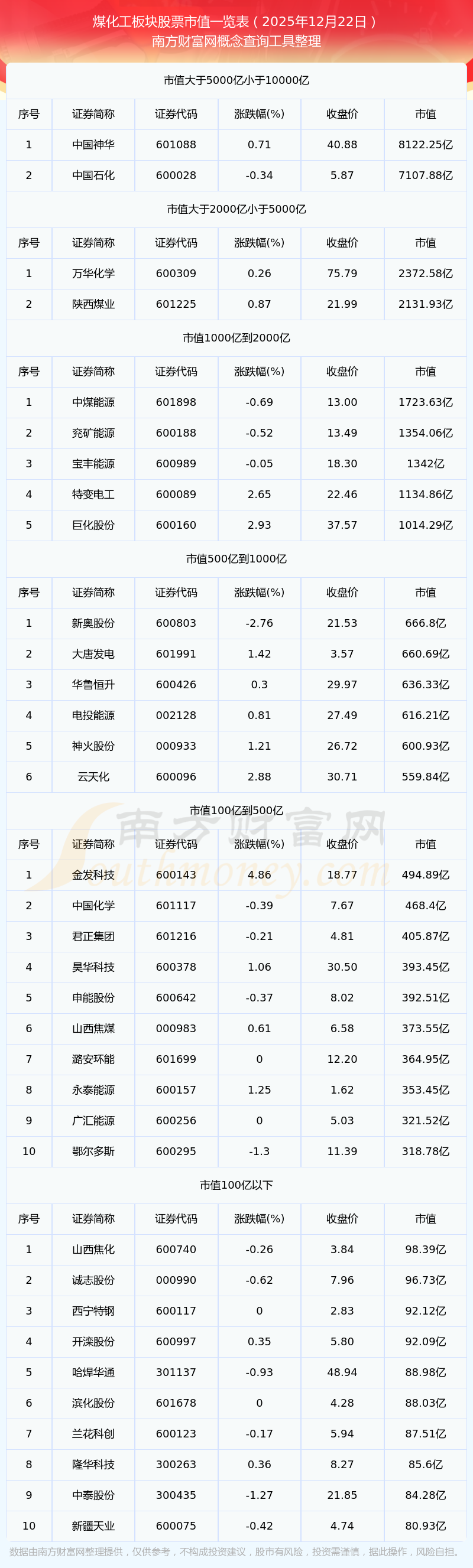 截止2025年12月22日,煤化工板塊股票中山西焦化、誠(chéng)志股份、西寧特鋼、開(kāi)灤股份等45家市值位于不足100億之列;金發(fā)科技、中國(guó)化學(xué)、君正集團(tuán)、昊華科技等37家市值位于100億到500億之列;新奧股份、大唐發(fā)電、華魯恒升、電投能源、神火股份等6家市值位于500億到1000億之列;中煤能源、兗礦能源、寶豐能源、特變電工、巨化股份等5家市值位于1000億到2000億之列;萬(wàn)華化學(xué)和陜西煤業(yè)市值位于2000億到5000億之列;中國(guó)神華和中國(guó)石化市值位于5000億到10000億之列。