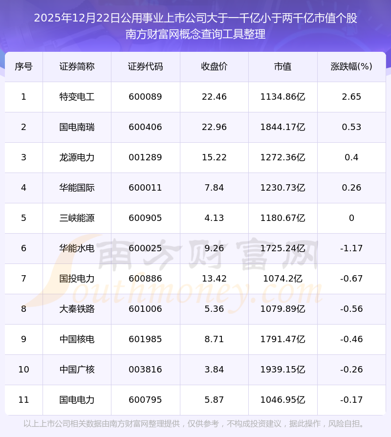 截止2025年12月22日,公用事業(yè)上市公司市值大于一千億小于兩千億的個(gè)股共有11只。其中,市值較高的有中國廣核、國電南瑞、中國核電,市值分別為1939.15億元、1844.17億元、1791.47億元。