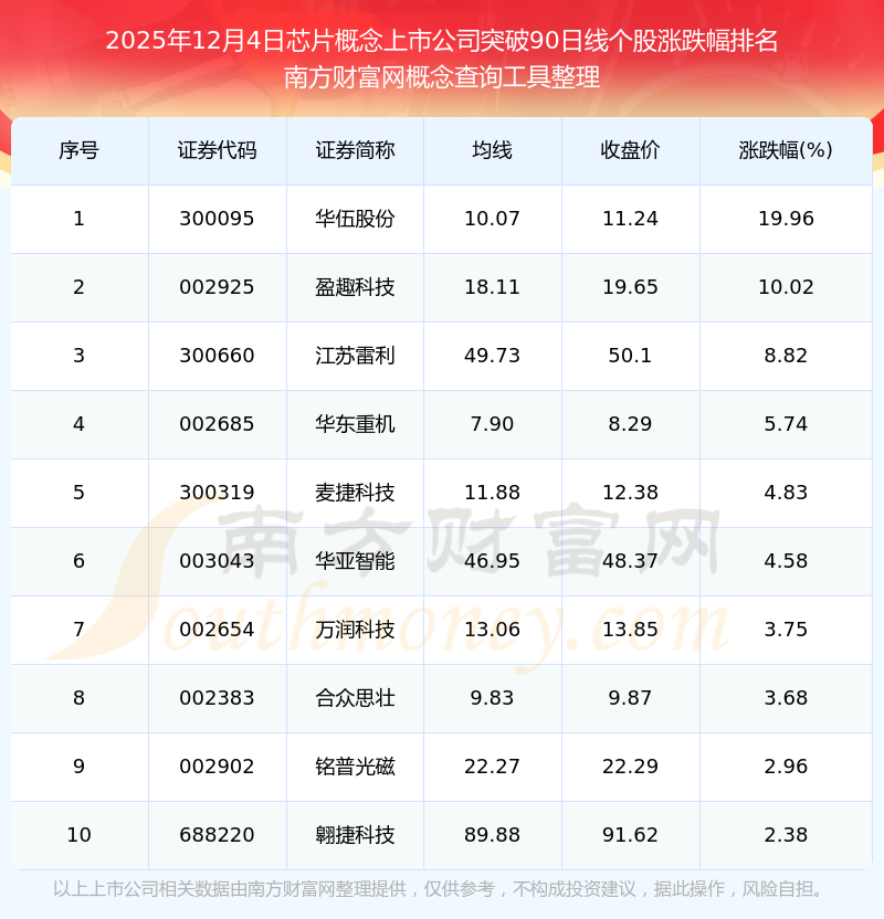 根據(jù)南方財(cái)富網(wǎng)概念查詢工具數(shù)據(jù)統(tǒng)計(jì),截止2025年12月4日收盤,芯片概念上市公司共有17只個(gè)股收盤價(jià)向上突破了90日線。其中漲幅較大的個(gè)股有華伍股份、盈趣科技、江蘇雷利等,漲幅分別為19.96%、10.02%、8.82%。