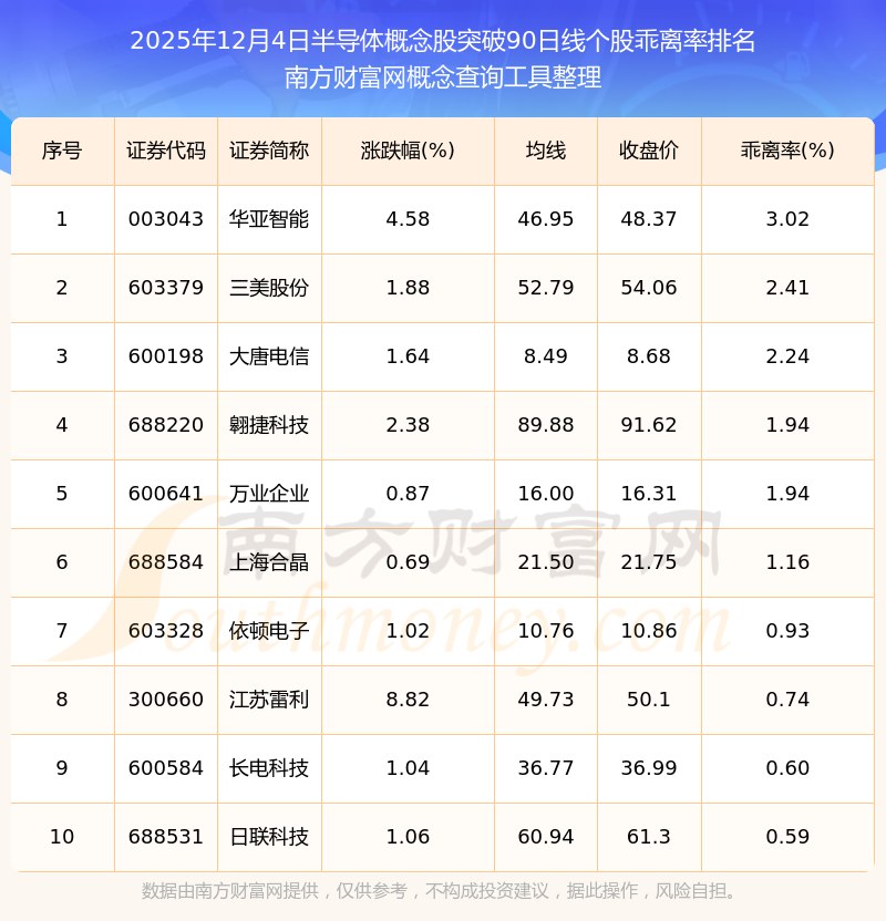 根據南方財富網概念查詢工具數據統(tǒng)計,截止2025年12月4日收盤,半導體概念股共有16只個股收盤價向上突破了90日線。其中乖離率較大的個股有華亞智能、三美股份、大唐電信等,乖離率分別為3.02%、2.41%、2.24%。