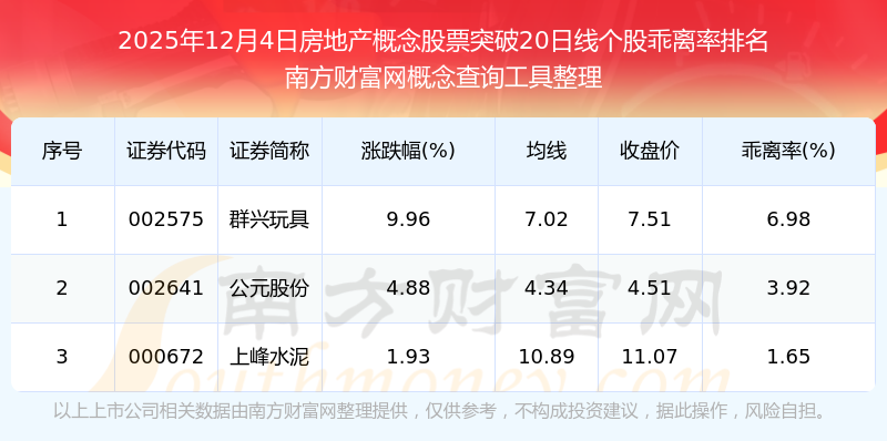 2025年12月4日房地產(chǎn)概念股票突破20日線個股乖離率排名