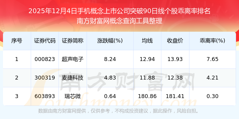 根據(jù)南方財(cái)富網(wǎng)概念查詢工具數(shù)據(jù)統(tǒng)計(jì),截止2025年12月4日收盤(pán),手機(jī)概念上市公司共有3只個(gè)股收盤(pán)價(jià)向上突破了90日線。其中乖離率較大的個(gè)股有超聲電子、麥捷科技、瑞芯微等,乖離率分別為7.65%、4.21%、0.30%。