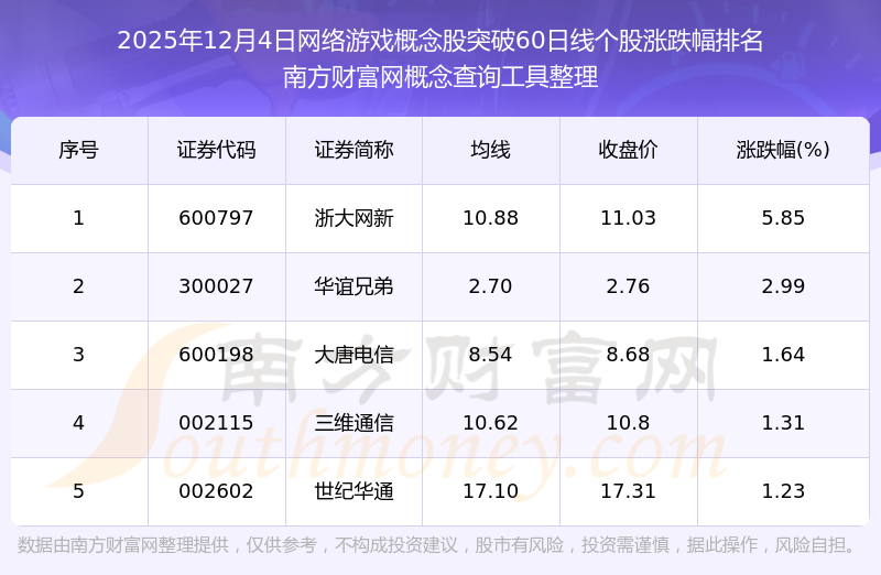 2025年12月4日網(wǎng)絡(luò)游戲概念股突破60日線個股漲跌幅排名