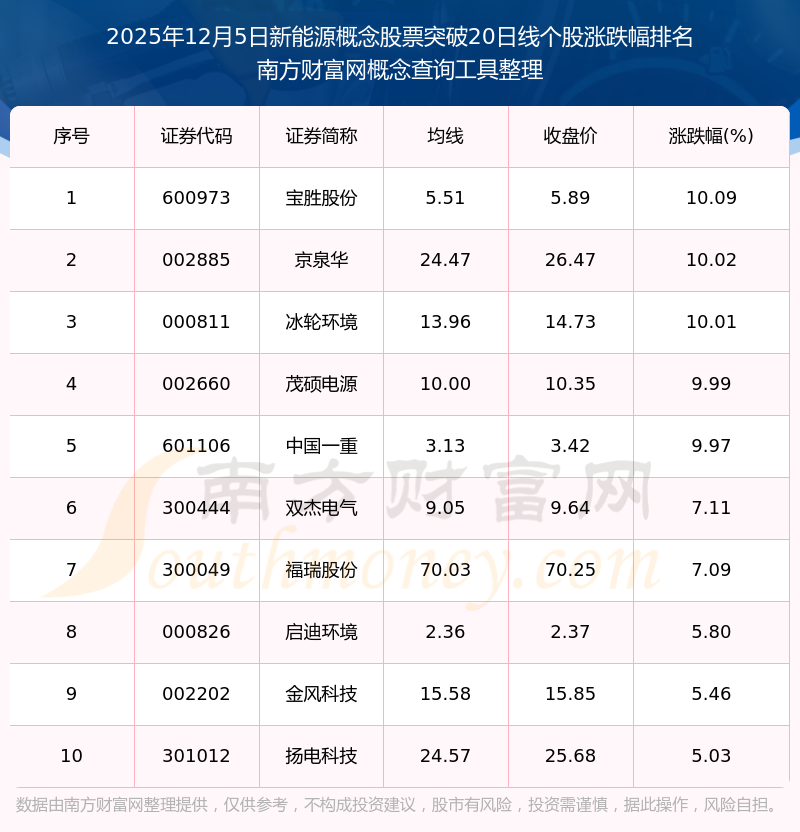2025年12月5日新能源概念股票突破20日線個股漲跌幅排名