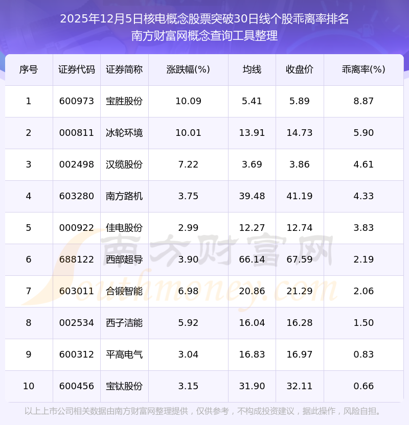 2025年12月5日核電概念股票突破30日線個股乖離率排名
