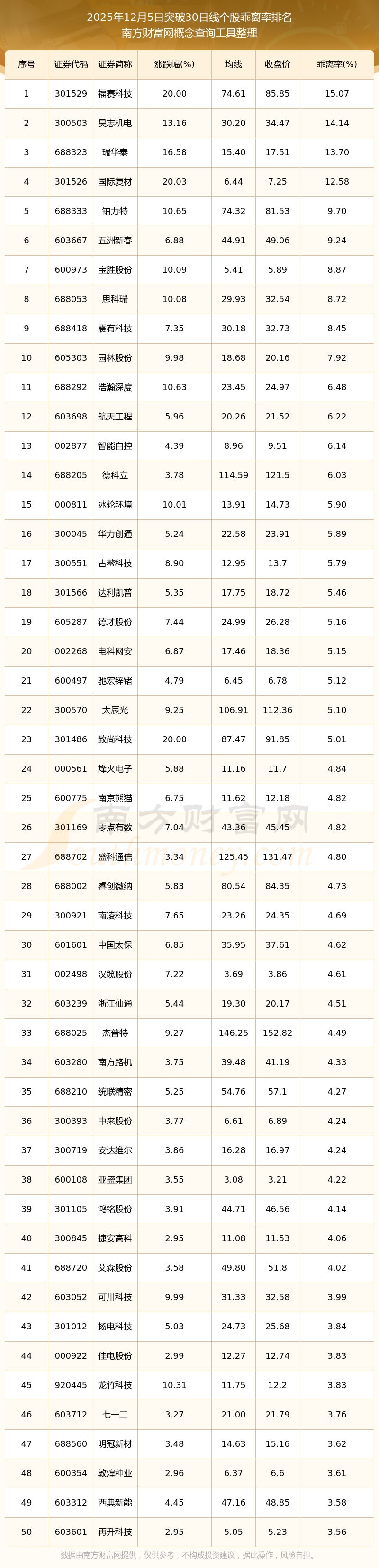根據(jù)南方財富網(wǎng)概念查詢工具數(shù)據(jù)統(tǒng)計,截止2025年12月5日收盤,共有115只個股收盤價向上突破了30日線,其中乖離率較大的個股有福賽科技、昊志機電、瑞華泰、國際復材、鉑力特等,乖離率分別為15.07%、14.14%、13.70%、12.58%、9.70%。