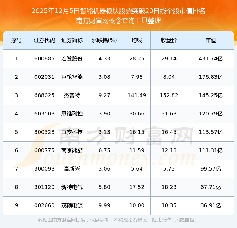 2025年12月5日智能機(jī)器板塊股票突破20日線個(gè)股市值排名