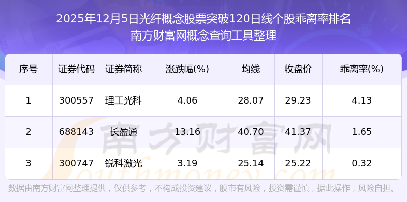 根據(jù)南方財富網(wǎng)概念查詢工具數(shù)據(jù)統(tǒng)計,截止2025年12月5日收盤,光纖概念股票共有3只個股收盤價向上突破了120日線。其中乖離率較大的個股有理工光科、長盈通、銳科激光等,乖離率分別為4.13%、1.65%、0.32%。
