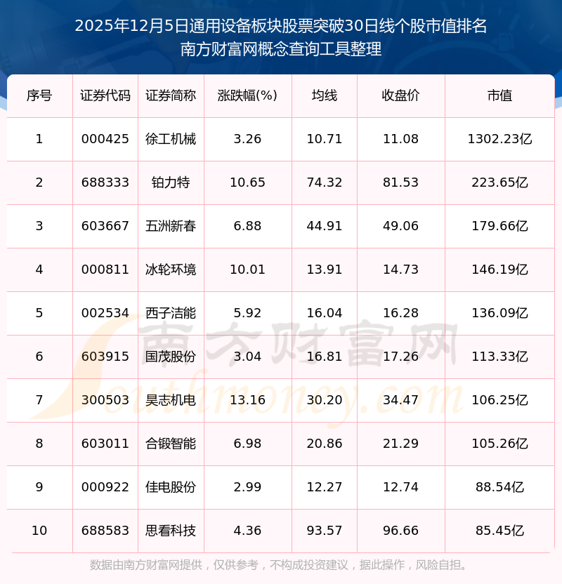 2025年12月5日通用設(shè)備板塊股票突破30日線個股市值排名