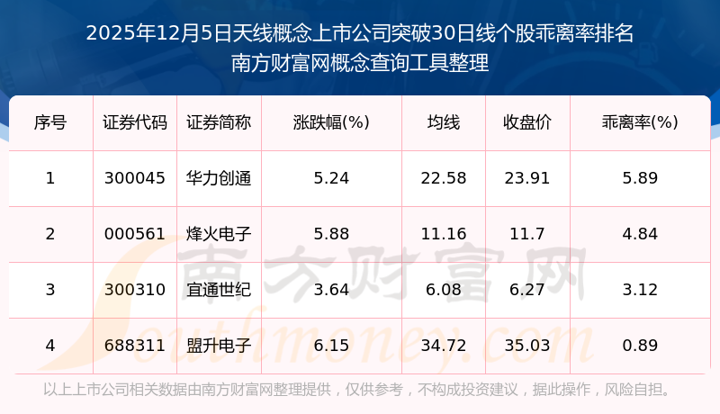 2025年12月5日天線概念上市公司突破30日線個股乖離率排名