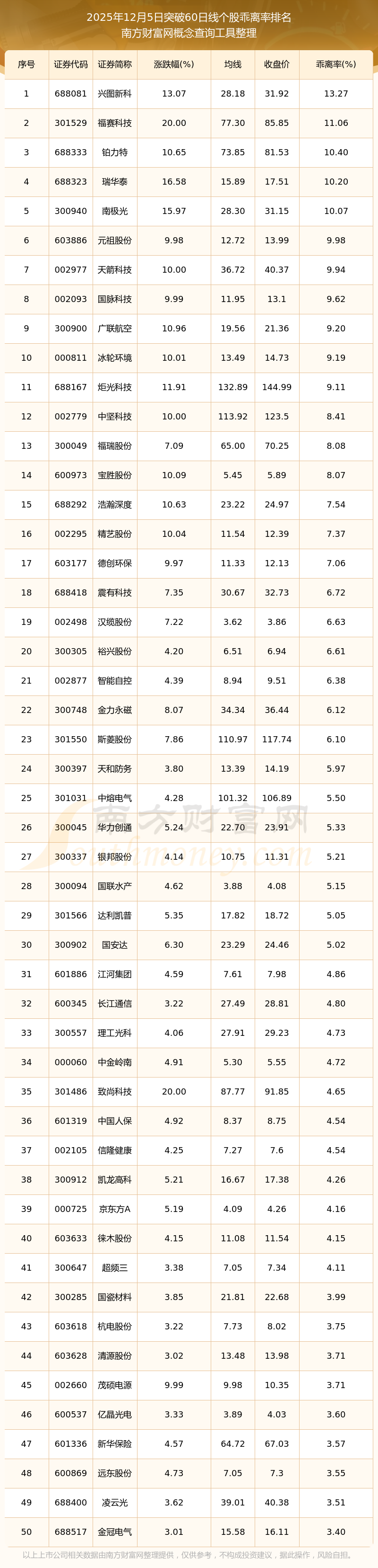 根據(jù)南方財富網(wǎng)概念查詢工具數(shù)據(jù)統(tǒng)計,截止2025年12月5日收盤,共有116只個股收盤價向上突破了60日線,其中乖離率較大的個股有興圖新科、福賽科技、鉑力特、瑞華泰、南極光等,乖離率分別為13.27%、11.06%、10.40%、10.20%、10.07%。