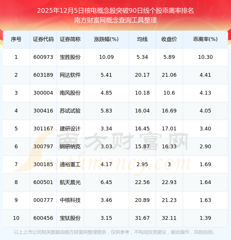 根據(jù)南方財富網(wǎng)概念查詢工具數(shù)據(jù)統(tǒng)計,截止2025年12月5日收盤,核電概念股共有10只個股收盤價向上突破了90日線。其中乖離率較大的個股有寶勝股份、網(wǎng)達軟件、南風股份等,乖離率分別為10.30%、4.41%、4.13%。