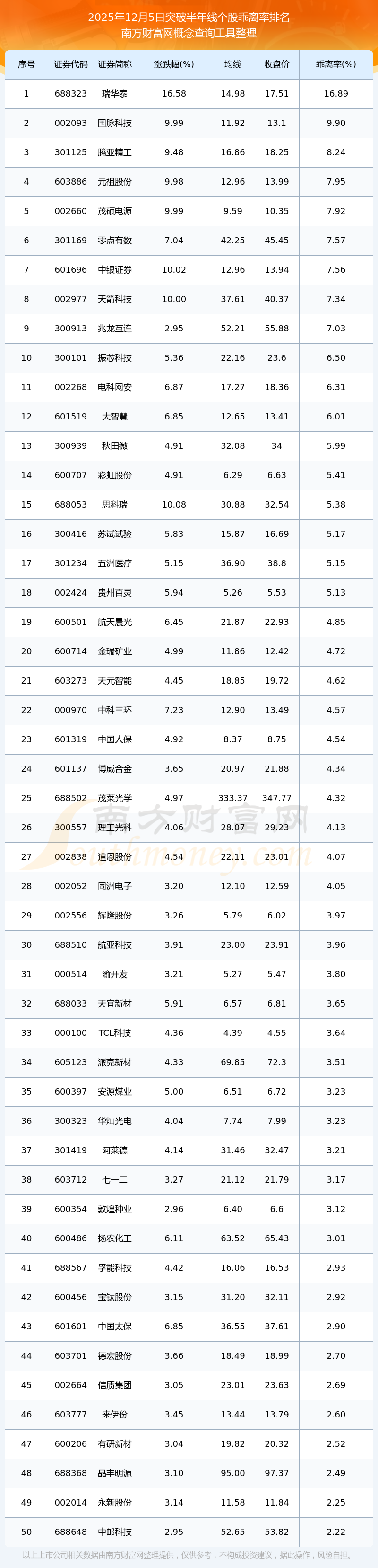 根據南方財富網概念查詢工具數據統(tǒng)計,截止2025年12月5日收盤,共有84只個股收盤價向上突破了半年線,其中乖離率較大的個股有瑞華泰、國脈科技、騰亞精工、元祖股份、茂碩電源等,乖離率分別為16.89%、9.90%、8.24%、7.95%、7.92%。