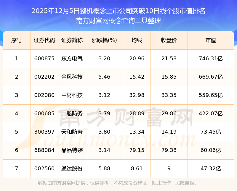 根據(jù)南方財富網(wǎng)概念查詢工具數(shù)據(jù)統(tǒng)計,截止2025年12月5日收盤,整機概念上市公司共有7只個股收盤價向上突破了10日線。其中市值較大的個股有東方電氣、金風(fēng)科技、中材科技等,市值分別為746.31億、669.67億、559.65億。