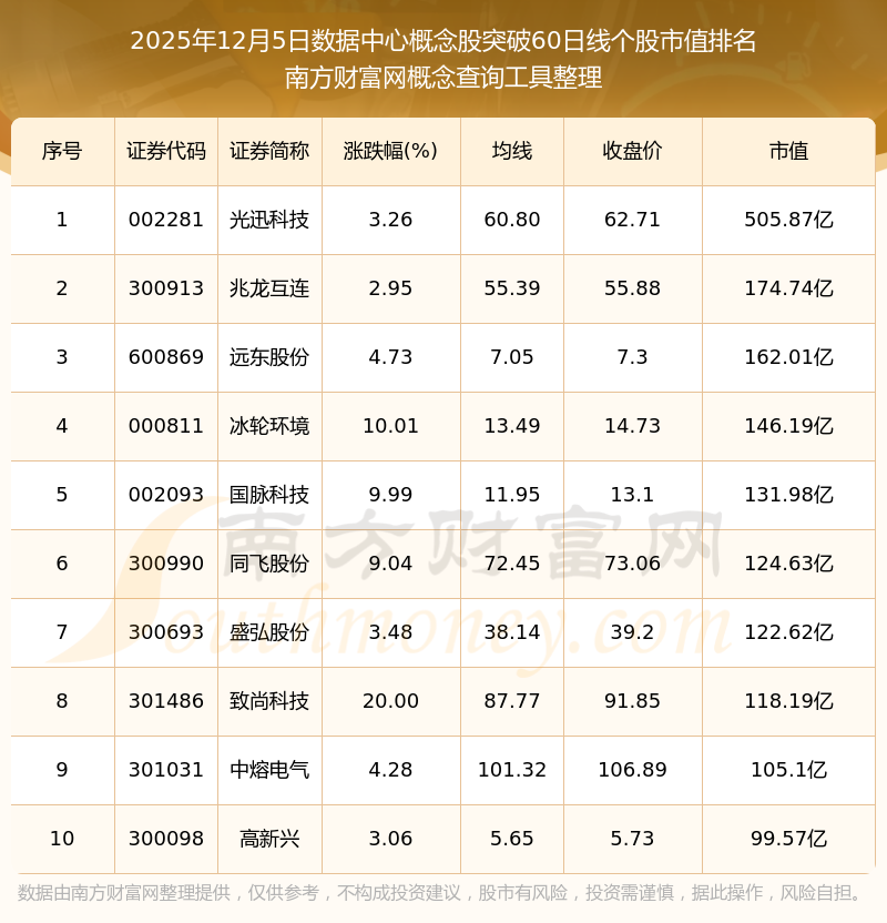 2025年12月5日數(shù)據(jù)中心概念股突破60日線個(gè)股市值排名