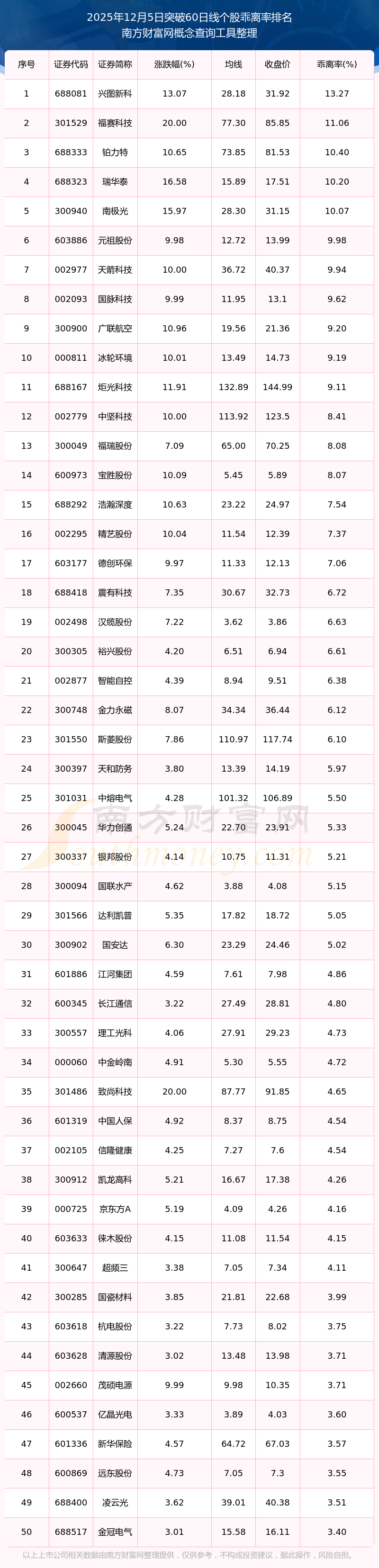 根據(jù)南方財富網(wǎng)概念查詢工具數(shù)據(jù)統(tǒng)計,截止2025年12月5日收盤,共有116只個股收盤價向上突破了60日線,其中乖離率較大的個股有興圖新科、福賽科技、鉑力特、瑞華泰、南極光等,乖離率分別為13.27%、11.06%、10.40%、10.20%、10.07%。