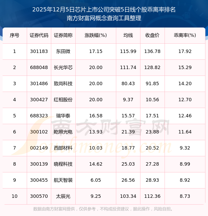 2025年12月5日芯片上市公司突破5日線個(gè)股乖離率排名