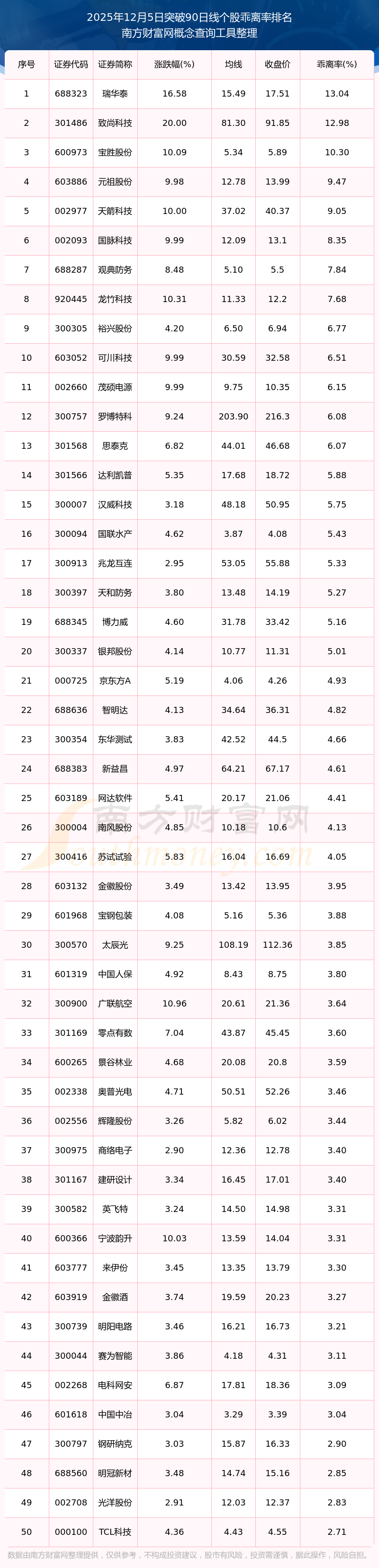 2025年12月5日突破90日線個(gè)股乖離率排名