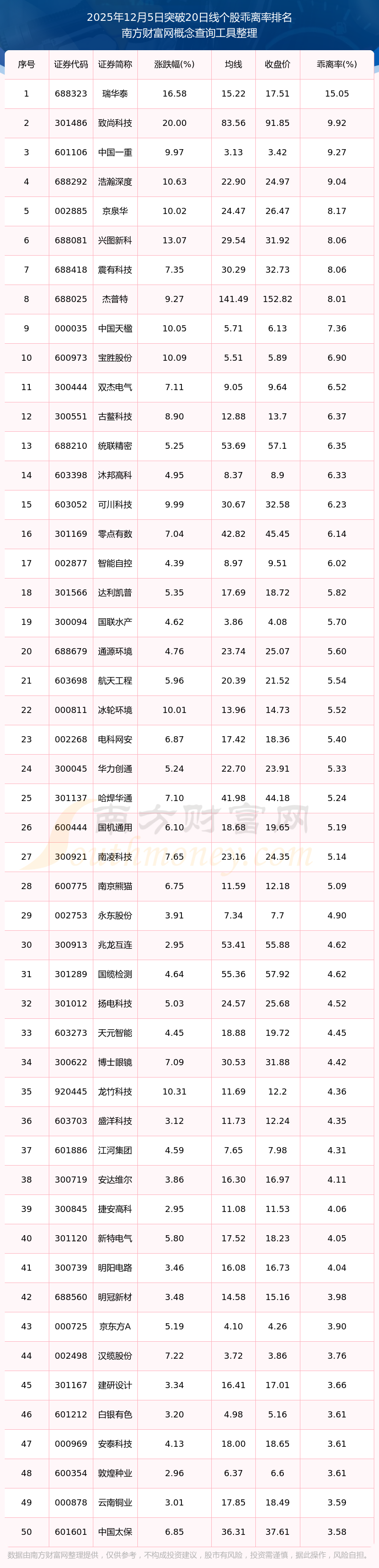 2025年12月5日突破20日線個(gè)股乖離率排名