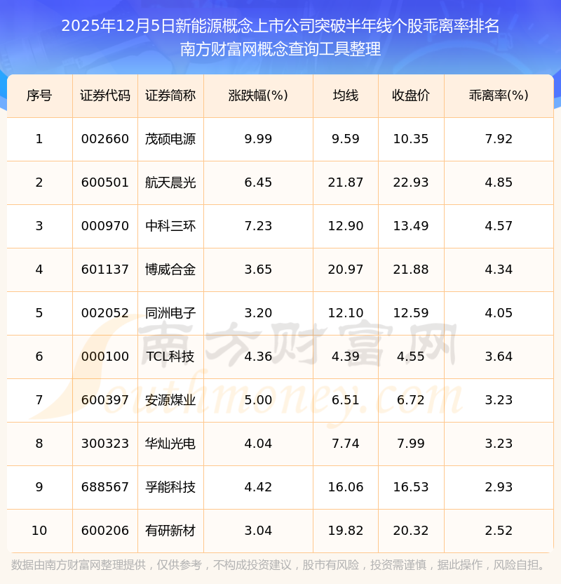 根據(jù)南方財(cái)富網(wǎng)概念查詢工具數(shù)據(jù)統(tǒng)計(jì),截止2025年12月5日收盤,新能源概念上市公司共有16只個(gè)股收盤價(jià)向上突破了半年線。其中乖離率較大的個(gè)股有茂碩電源、航天晨光、中科三環(huán)等,乖離率分別為7.92%、4.85%、4.57%。