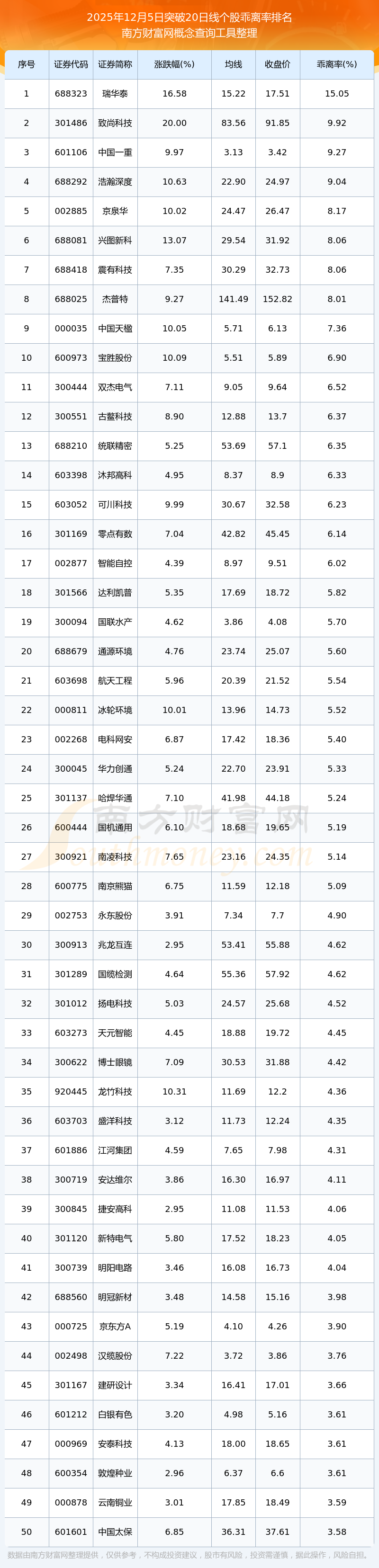 根據(jù)南方財富網(wǎng)概念查詢工具數(shù)據(jù)統(tǒng)計,截止2025年12月5日收盤,共有126只個股收盤價向上突破了20日線,其中乖離率較大的個股有瑞華泰、致尚科技、中國一重、浩瀚深度、京泉華等,乖離率分別為15.05%、9.92%、9.27%、9.04%、8.17%。