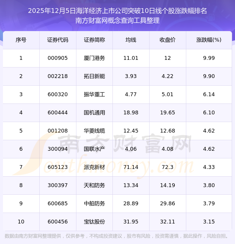 2025年12月5日海洋經(jīng)濟(jì)上市公司突破10日線個股漲跌幅排名
