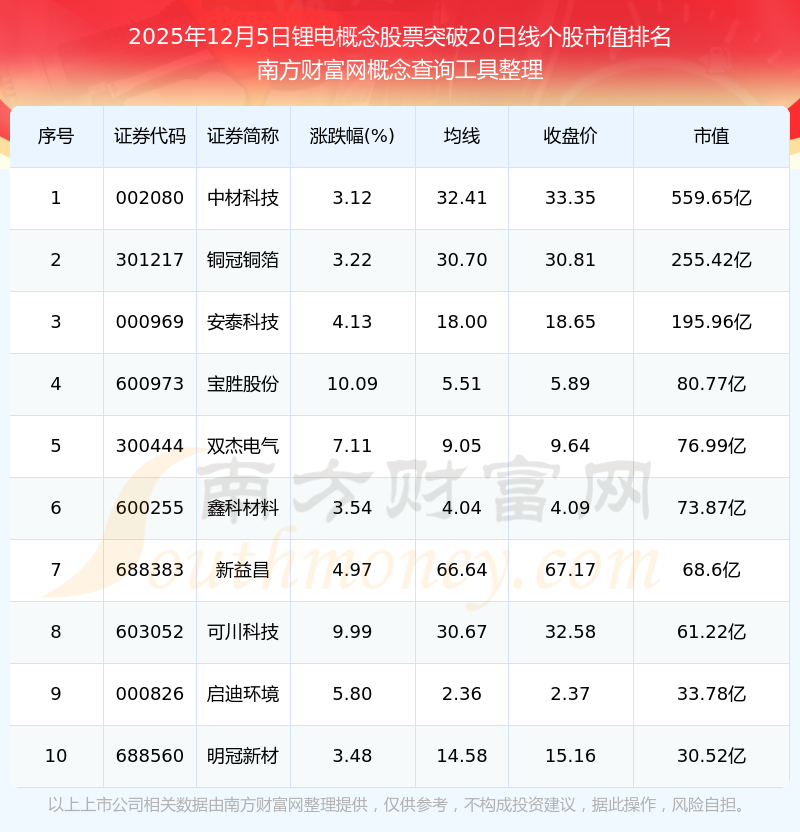 2025年12月5日鋰電概念股票突破20日線個股市值排名