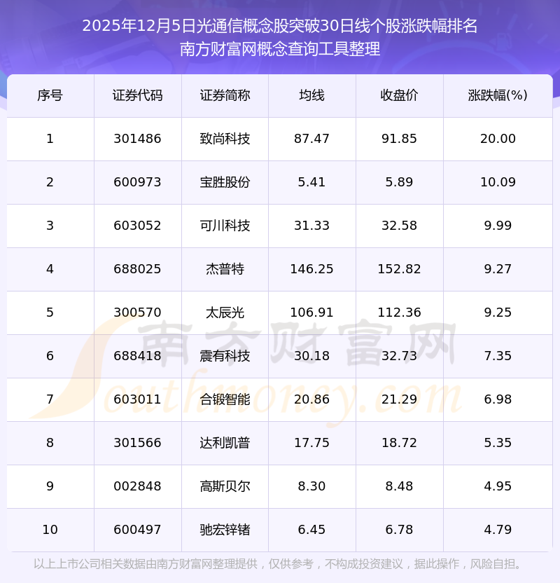 2025年12月5日光通信概念股突破30日線個(gè)股漲跌幅排名