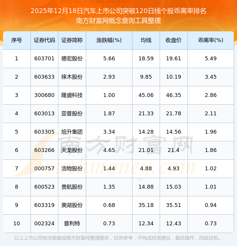 根據(jù)南方財富網(wǎng)概念查詢工具數(shù)據(jù)統(tǒng)計,截止2025年12月18日收盤,汽車上市公司共有11只個股收盤價向上突破了120日線。其中乖離率較大的個股有德宏股份、徠木股份、隆盛科技等,乖離率分別為5.49%、3.45%、2.86%。
