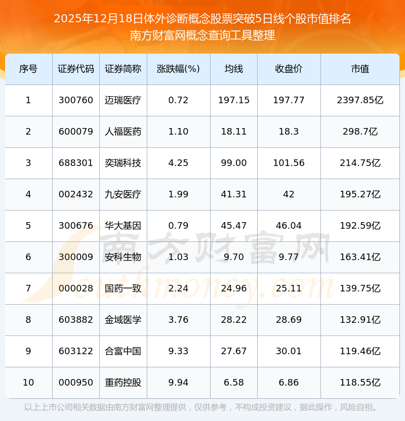 2025年12月18日體外診斷概念股票突破5日線個(gè)股市值排名