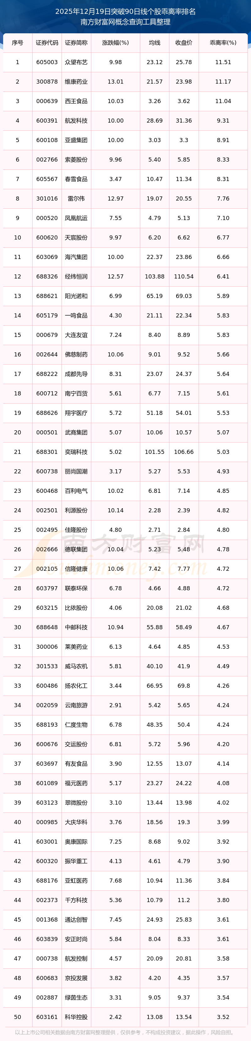 根據(jù)南方財富網(wǎng)概念查詢工具數(shù)據(jù)統(tǒng)計,截止2025年12月19日收盤,共有309只個股收盤價向上突破了90日線,其中乖離率較大的個股有眾望布藝、維康藥業(yè)、西王食品、航發(fā)科技、亞盛集團等,乖離率分別為11.51%、11.17%、11.04%、9.31%、8.91%。