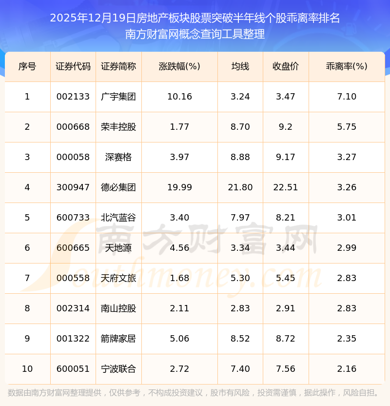 2025年12月19日房地產(chǎn)板塊股票突破半年線個(gè)股乖離率排名