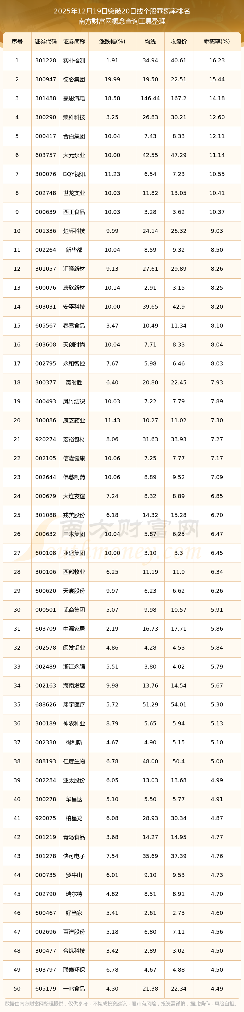根據(jù)南方財富網(wǎng)概念查詢工具數(shù)據(jù)統(tǒng)計,截止2025年12月19日收盤,共有482只個股收盤價向上突破了20日線,其中乖離率較大的個股有實樸檢測、德必集團、豪恩汽電、榮科科技、合百集團等,乖離率分別為16.23%、15.44%、14.18%、12.60%、12.11%。