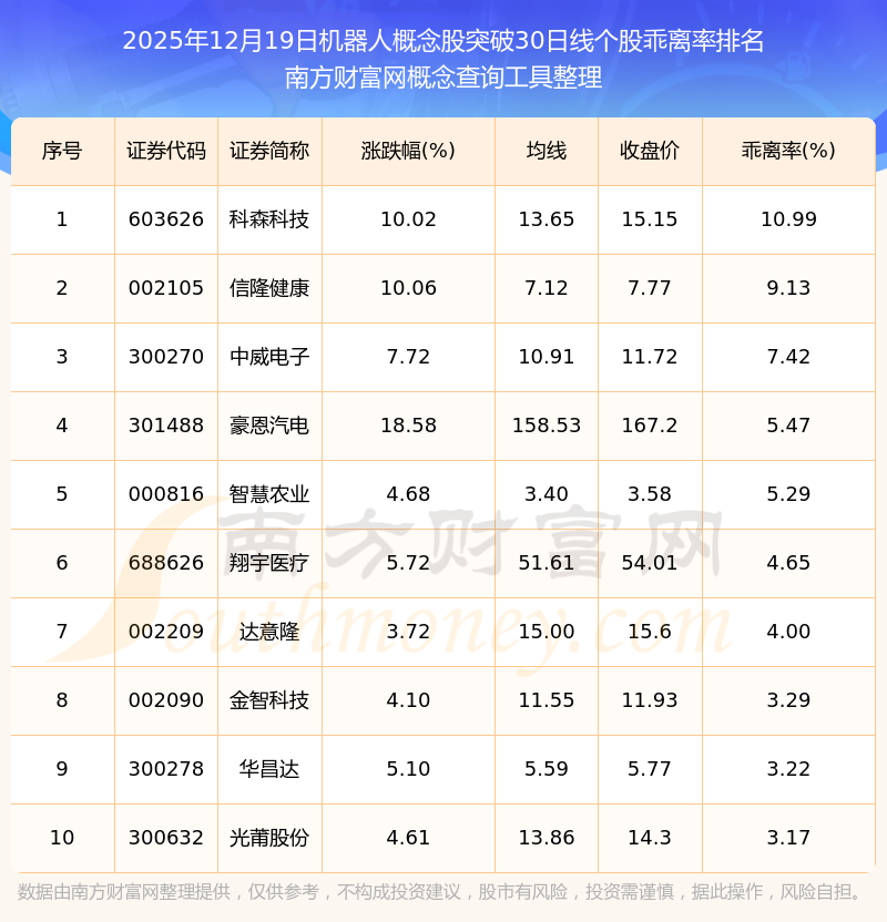 2025年12月19日機(jī)器人概念股突破30日線個股乖離率排名