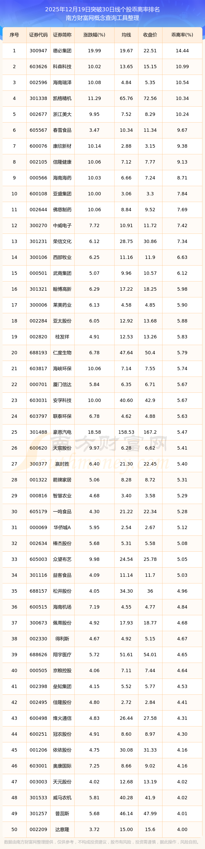 2025年12月19日突破30日線個(gè)股乖離率排名
