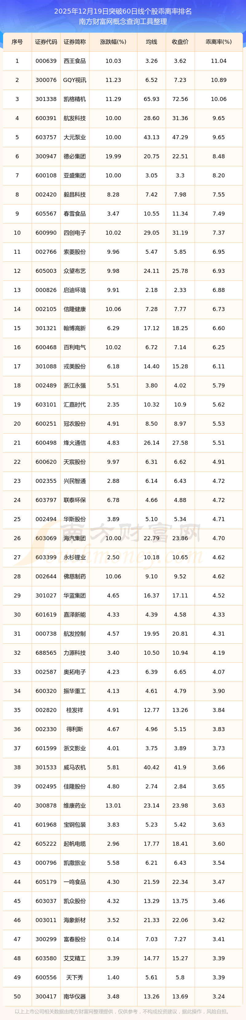 根據(jù)南方財富網(wǎng)概念查詢工具數(shù)據(jù)統(tǒng)計,截止2025年12月19日收盤,共有286只個股收盤價向上突破了60日線,其中乖離率較大的個股有西王食品、GQY視訊、凱格精機、航發(fā)科技、大元泵業(yè)等,乖離率分別為11.04%、10.89%、10.06%、9.65%、9.65%。